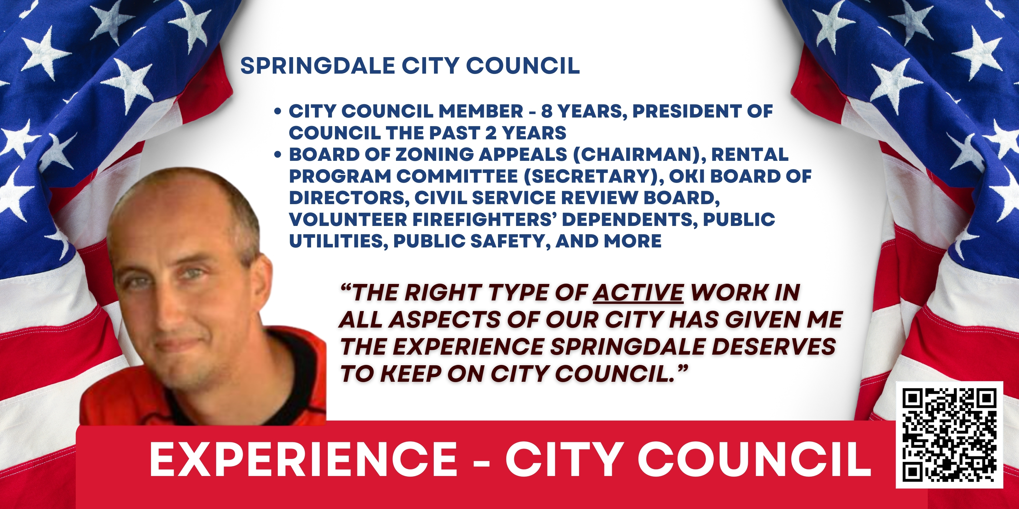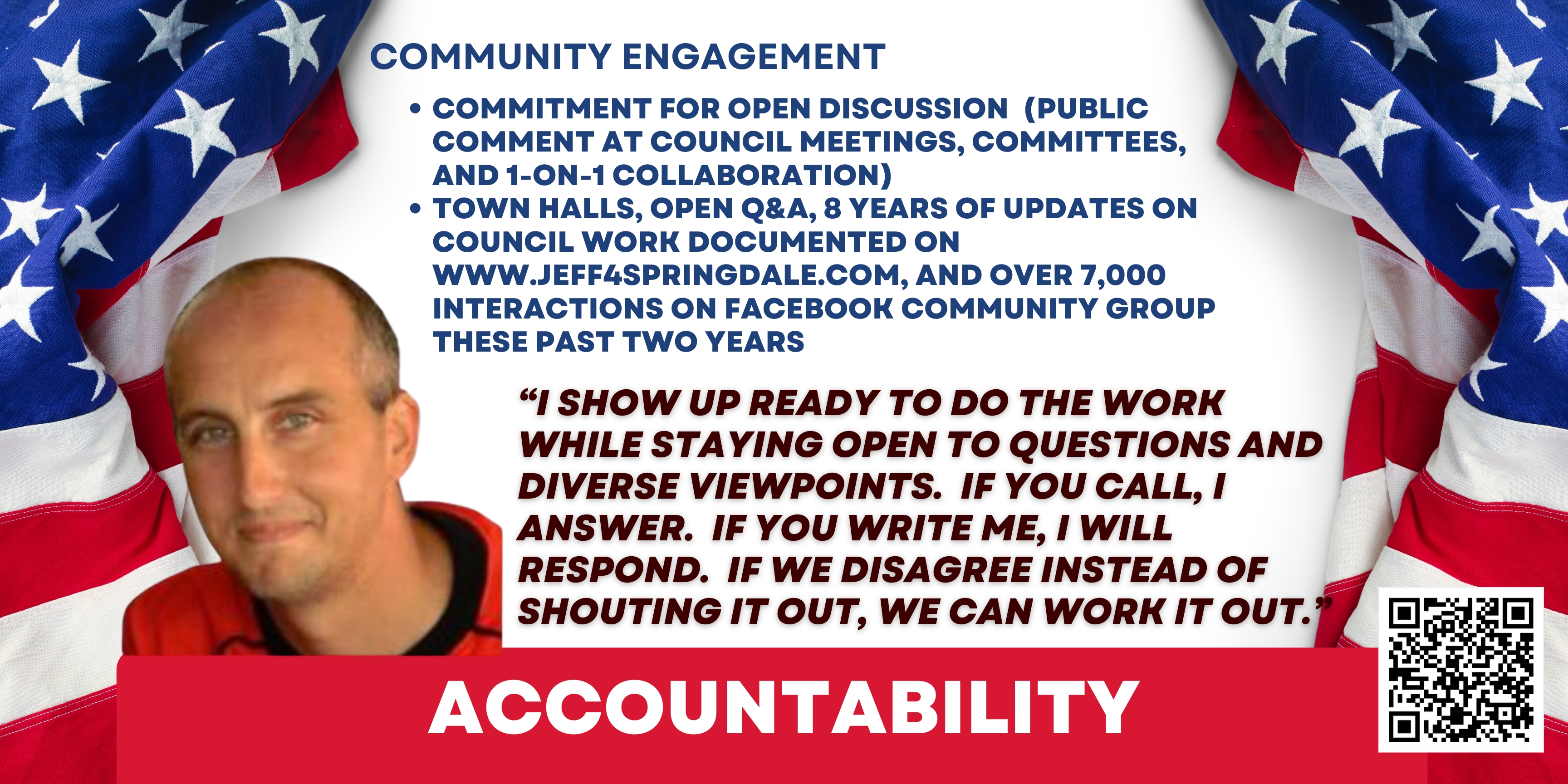 I have always made being accessible and accountable a priority for local government with open 2-way communication not just something to strive for but a regular practice. Please take a few minutes to look through this site where I talk more about my background and where I stand on current issues. I have kept this website to post thoughts on larger issues since I was first elected to City Council in 2017 and for the past several years I have found the very well managed Springdale Facebook group a great place for shorter updates and discussions.